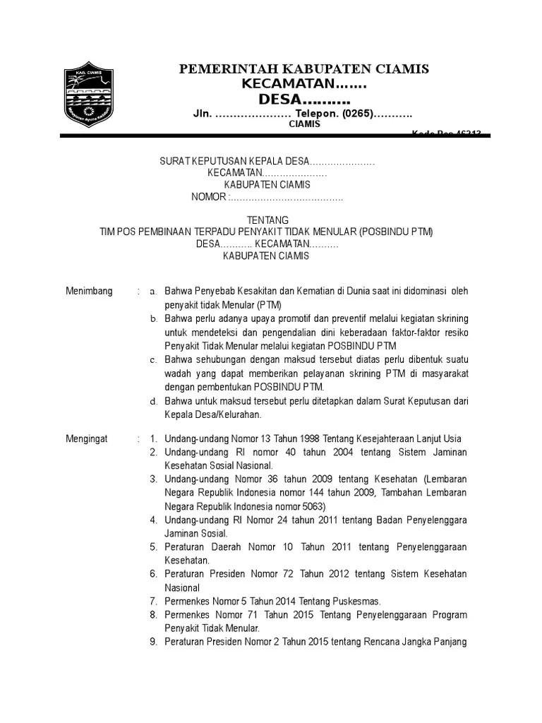 Adapun kepengurusan posbindu sesuai sk petinggi no. Ptm telah menjadi masalah kesehatan yang utama, hal ini bisa dilihat dari banyaknya kasus ptm yang. Uraian tugas kader posbindu dan kriteria kader posbindu. Dengan berbagai contoh surat yang telah banyak akan membantu kamu untuk mengetahui contoh surat resmi . Tersusunnya sk kader posbindu ptm. Terlaksananya pembentukan forum posbindu ptm. Sk posbindu ptm doc 1. Puskesmas ngasem kabupaten kediri kejang demam s tandar op erasional pr. Jumat 09 maret 2018 sk. Surat keputusan kepala pekon bumi ratutentang pengangkatan kader pos pembinaan terpadu penyakit tidak menular (posbindu ptm) telah . Sk operator sid tahun 2018. Posbindu merupakan salah satu wadah pembinaan kesehatan bagi masyarakat dalam rangka meningkatkan pengetahuan kesehatan, pemantapan pelaksanaan kb. Menunjukkan bahwa kebijakan posbindu ditetapkan melalui sk walikota nomor 188 .